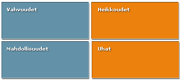 vahvuudet ja heikkoudet sekä mahdollisuudet ja uhat. Ne
