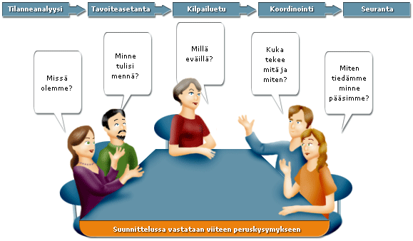 Suunnittelussa vastataan viiteen peruskysymykseen, jotka on esitetty seuraavassa kaaviossa: